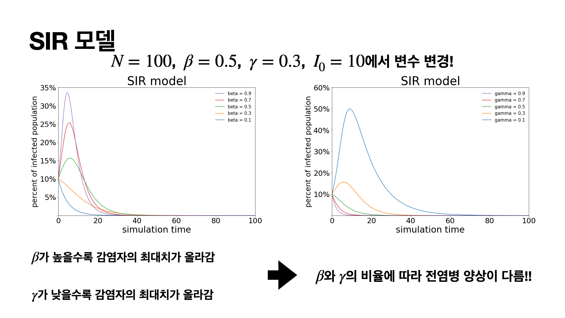 $\beta$에 대한 값은 감염발생율에 해당하므로 이 값이 높을수록 감염자의 최대치가 증가하는게 이해할 수 있고, $\gamma$에 대한 값은 회복율에 해당하므로 이 값이 낮을수록 감염자의 최대치가 증가하는게 이해가 됩니다.