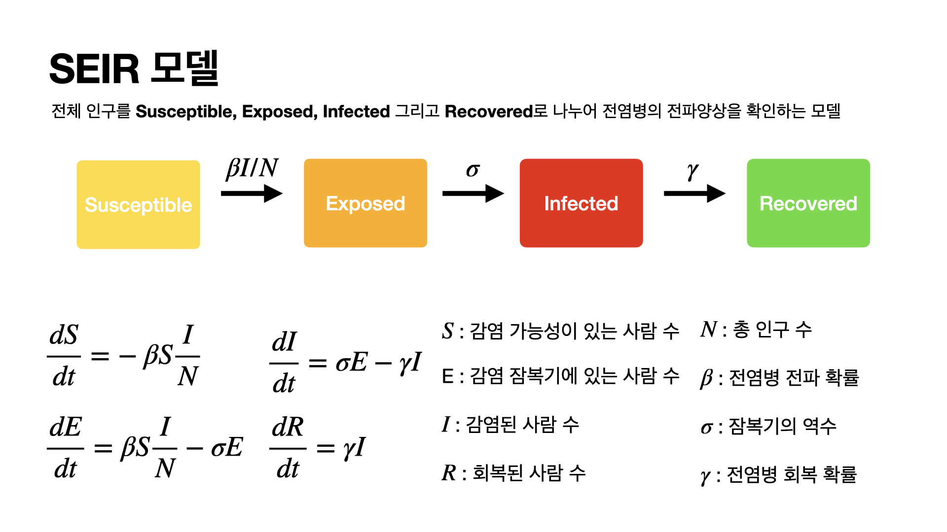 또한 잠복기인 사람이 증상이 나타나는 감염된 사람이 되기 까지의 기간에 대한 역수가 $\sigma$입니다. 예를 들어서 코로나의 경우 14일이라고 하면 $\sigma$는 그에 역수인 $\sigma = 0.0714$에 해당하게 됩니다.