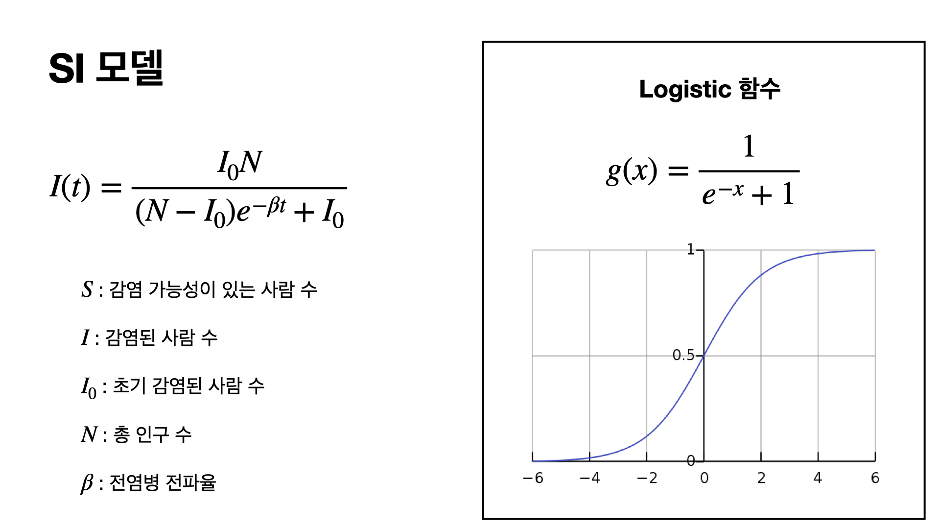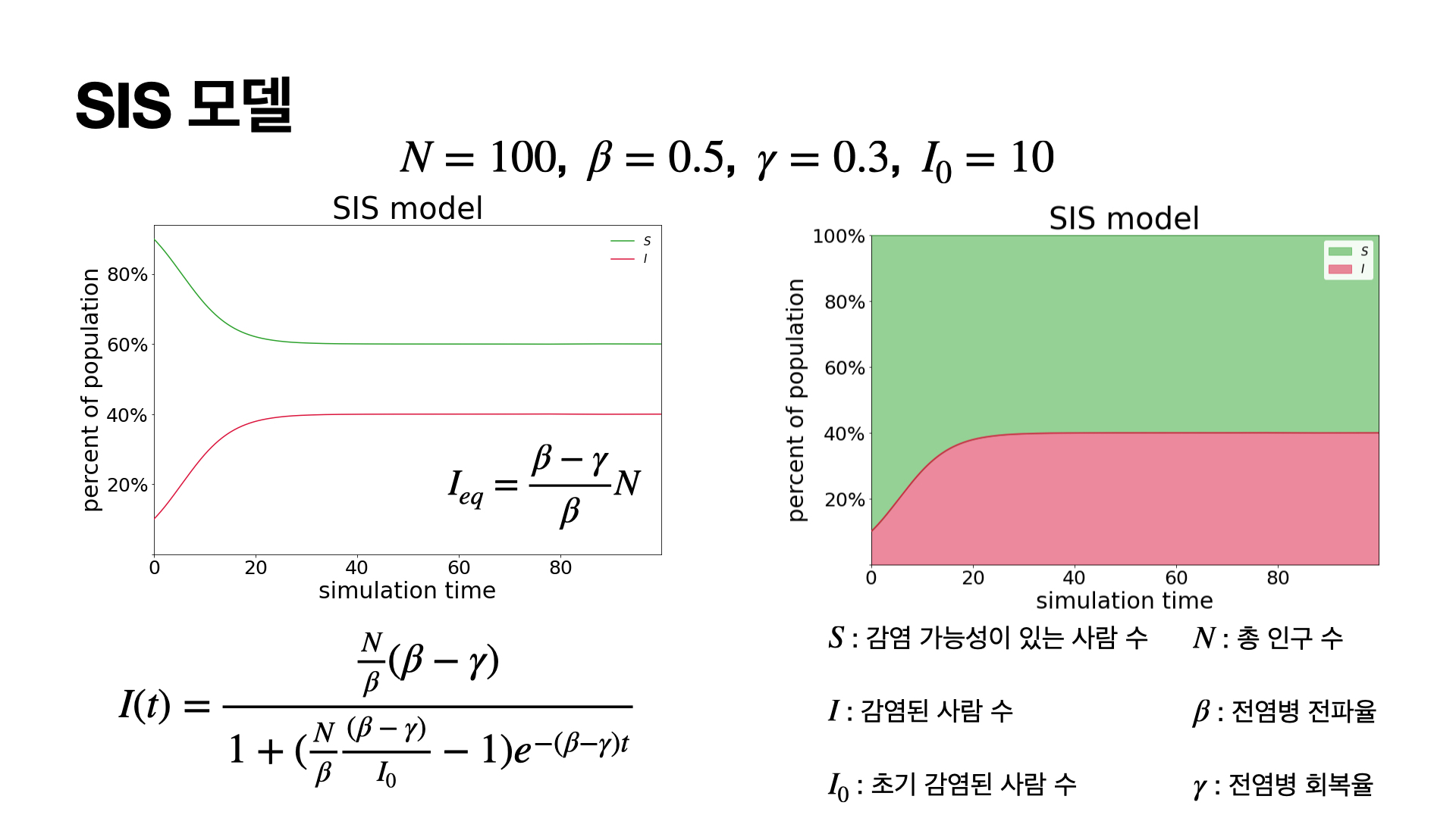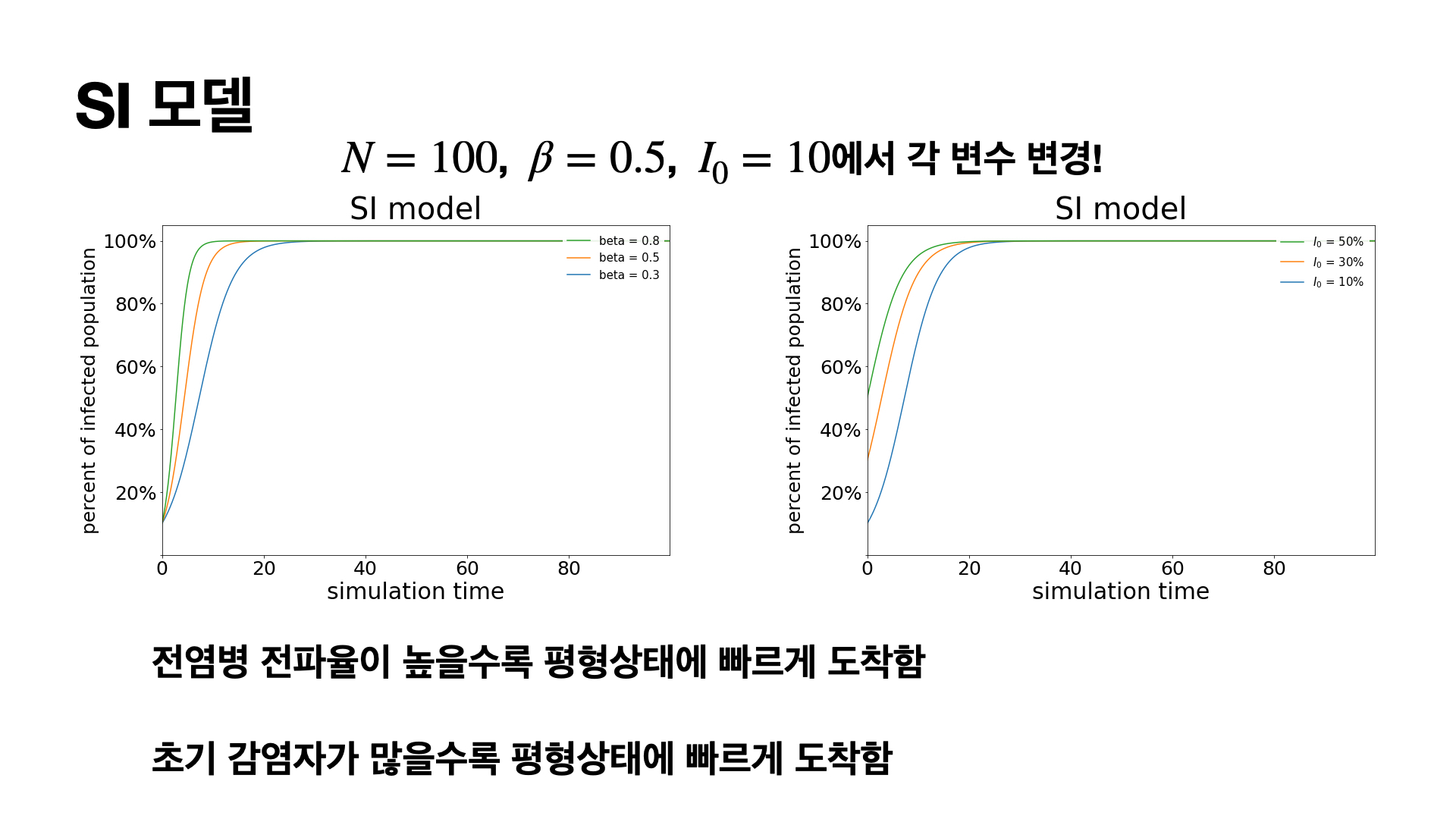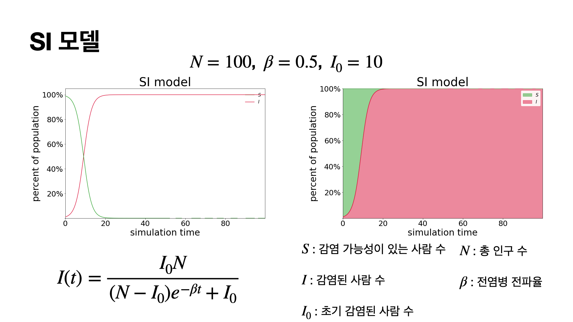 이 식을 잘 살펴보면 Logistic 함수와 같은 꼴로 나오게 되는데 결국 시간이 지남에 따라서 전체 인구수가 감염이 되는 경우로 수렴하는 것을 볼 수 있습니다.