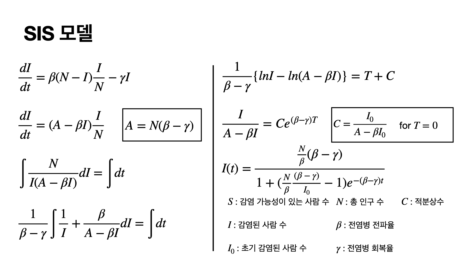 감염자의 수가 시간에 따라서 어떤 식으로 변하는지를 확인해보기 위해서 식을 정리해주면 결국에 $S+I = N$이므로 $S= N-I$로 볼 수 있습니다.