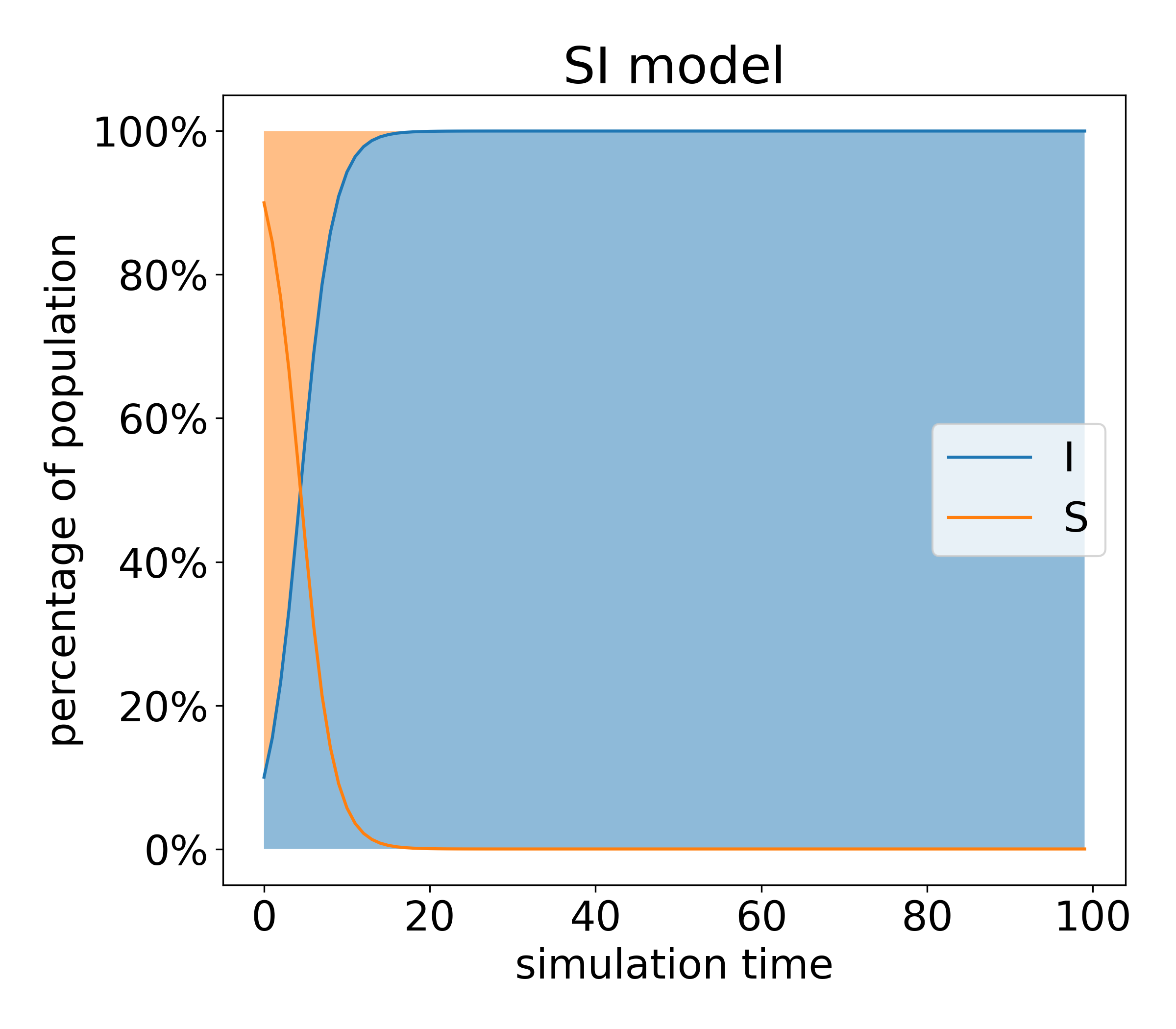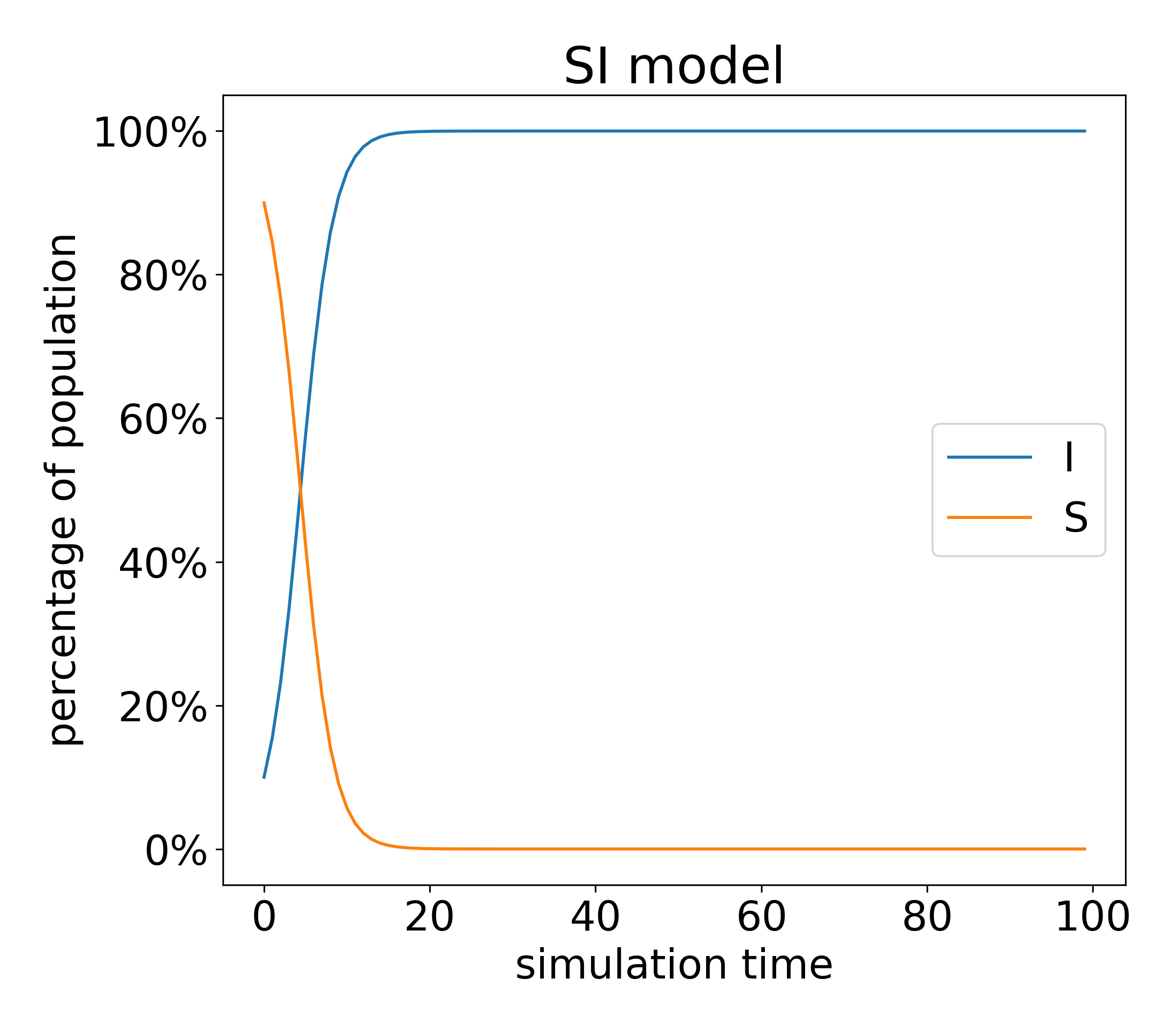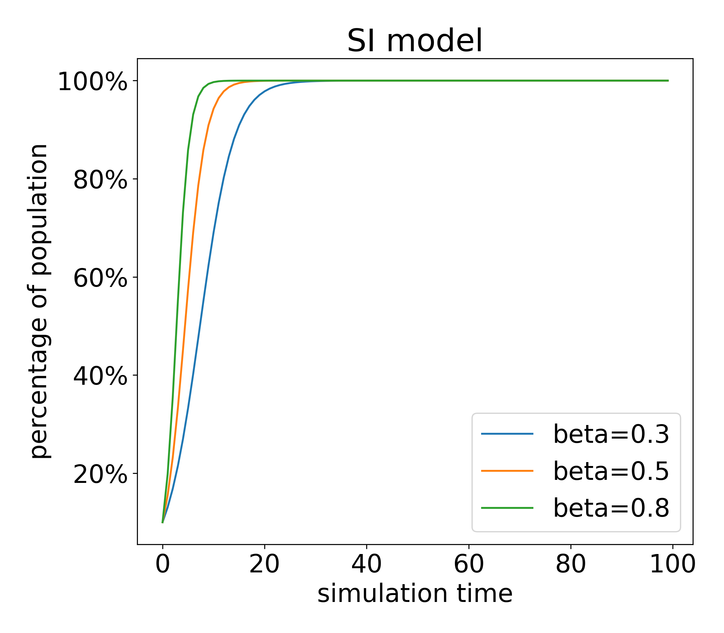 그래프의 경향을 살펴보면 일정 시간동안은 감염자수가 증가하지만 일정 시간이 지나가면 감염자의 수가 일정 비율을 유지하는 것을 살펴볼 수 있습니다. 지금 모델에서 생각해봐야하는 점은 시간이 지나도 감염자수가 사라지지 않고 유지된다는 점입니다.