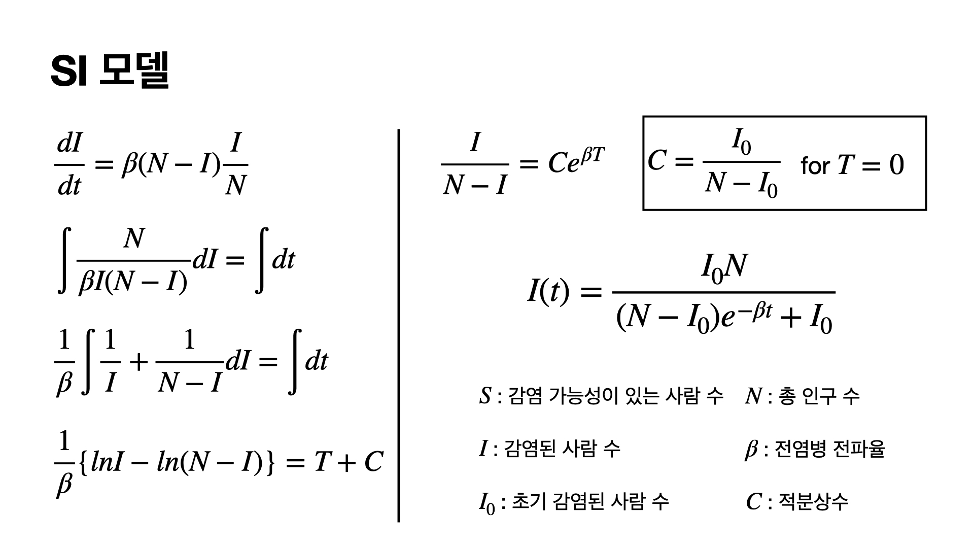 식을 정리하여 $I$와 $t$끼리 양변에 분배해주고 적분을 해주면 미정계수는 T=0일때의 값으로 생각해줄 수 있는데 이경우가 초기 감염된 사람의 수를 바탕으로 얻을 수 있고 이를 정리해주면 $I(t)$를 얻을 수 있습니다.